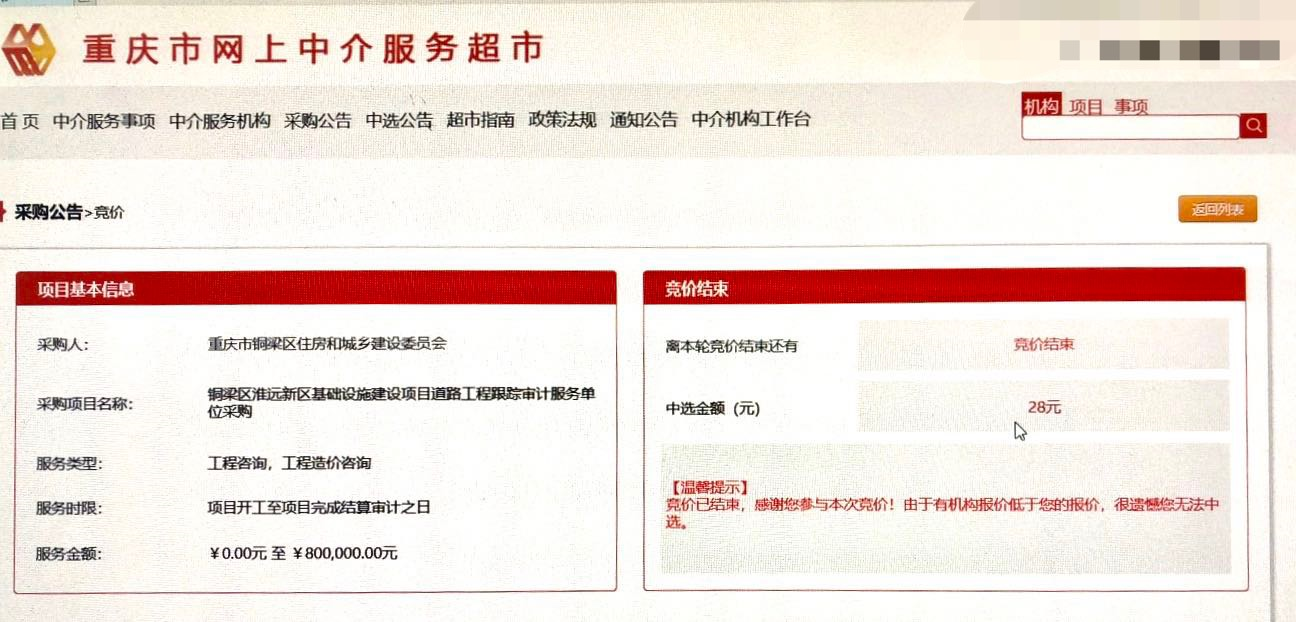 昨日,建设第一传媒发布了【投资额2亿项目全过程造价跟踪审计28元中标】文章后,引起业内广泛关注和讨论。今日记者陆续接到采购人及交易平台-“重庆市网上中介服务超市”的主动联系回复。事件详情如下: