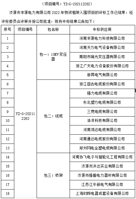 时博(中国)市丰源电力有限公司2022年物资框架入围项目中标结果公告