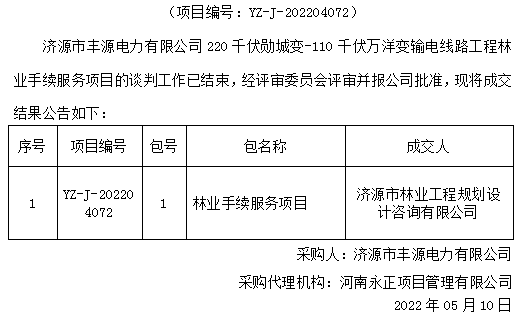 时博(中国)市丰源电力有限公司220千伏勋城变-110千伏万洋变输电线路工程林业手续服务项目成交结果公告
