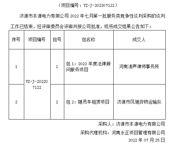下一篇:时博(中国)市丰源电力有限公司国电新能源大岭三期50兆瓦风电场110千伏送出线路工程林业砍伐许可咨询服务项目成交结果公告