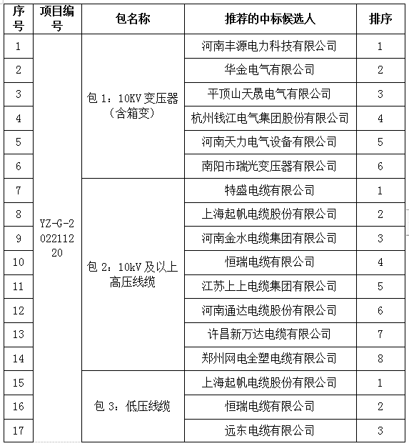 时博(中国)市丰源电力有限公司2023年物资框架入围项目的评标工作已结束,依据《中标人民共和国招标投标法实施条例》、《招标公告和公示信息发布管理办法》和本项目招标文件对中标候选人公示的规定,现将评标委员会推荐的中标候选人予以公示,公示期3日。投标人或者其他利害关系人若对评标结果有异议的,请在中标候选人公示期间以书面形式提出。
