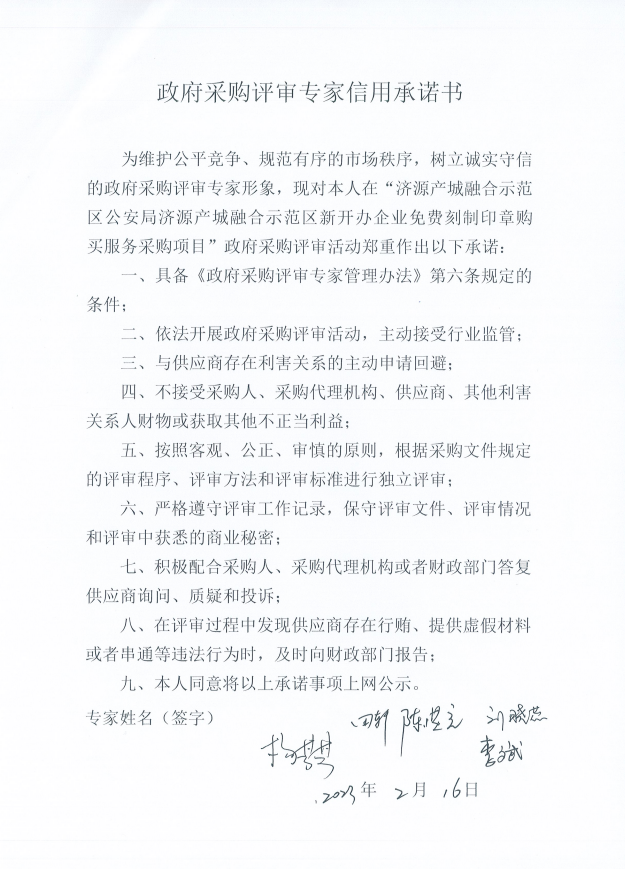 | 采购人指定的其所在地行政区域内的任何地点。 | 成交供应商所提供的服务内容应该以磋商文件要求及响应文件承诺为准执行;成交供应商提供服务时,如采购人发现与磋商文件及响应文件承诺不一致时,三次以内,采购人将扣除其服务费的5%。 | 合同签订之日起2年,在服务期限内接到印章需求时,在1个小时内完成刻章并备案。 | / |