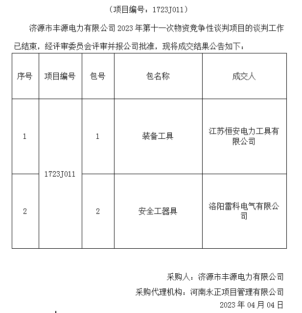 时博(中国)市丰源电力有限公司2023年第十一次物资竞争性谈判项目成交结果公告