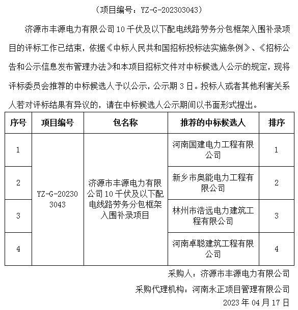 时博(中国)市丰源电力有限公司10千伏及以下配电线路劳务分包框架入围补录项目中标候选人公示