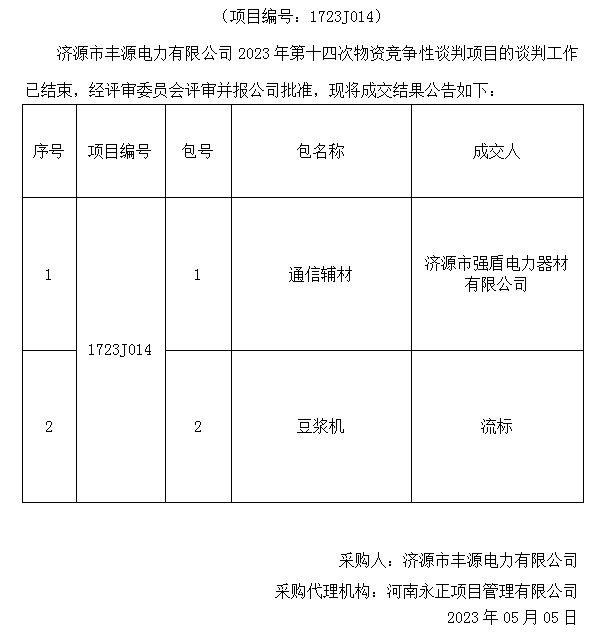 时博(中国)市丰源电力有限公司2023年第十四次物资竞争性谈判项目成交结果公告