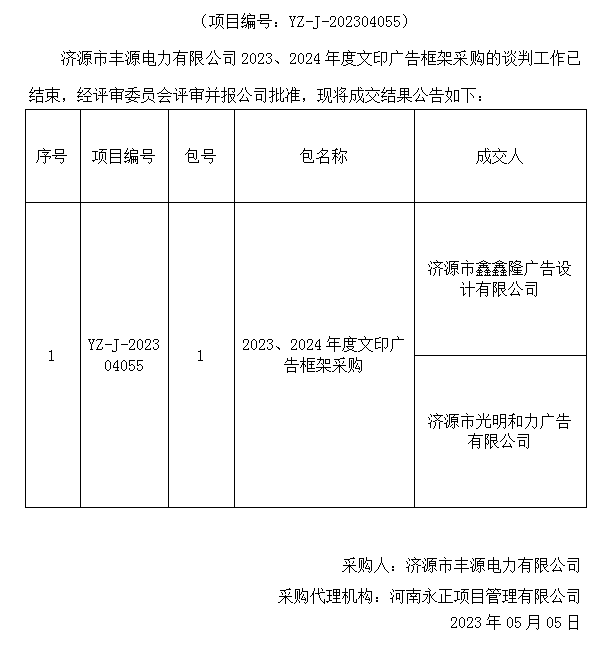 时博(中国)市丰源电力有限公司2023、2024年度文印广告框架采购成交结果公告