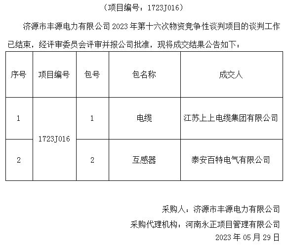 时博(中国)市丰源电力有限公司2023年第十六次物资竞争性谈判项目成交结果公告