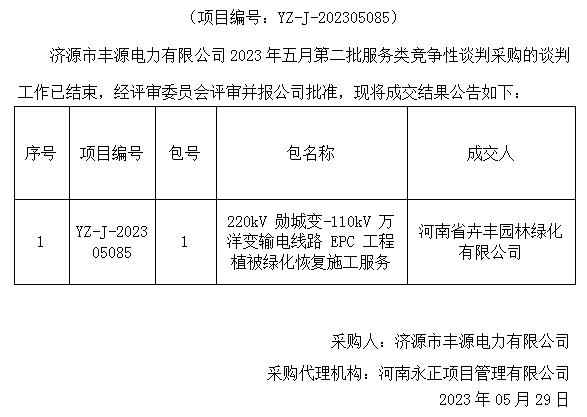 时博(中国)市丰源电力有限公司2023年五月第二批服务类竞争性谈判采购成交结果公告
