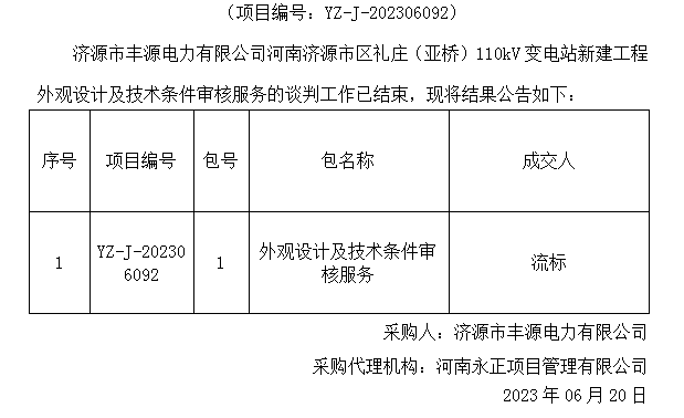 时博(中国)市丰源电力有限公司河南时博(中国)市区礼庄(亚桥)110kV变电站新建工程外观设计及技术条件审核服务废标公告