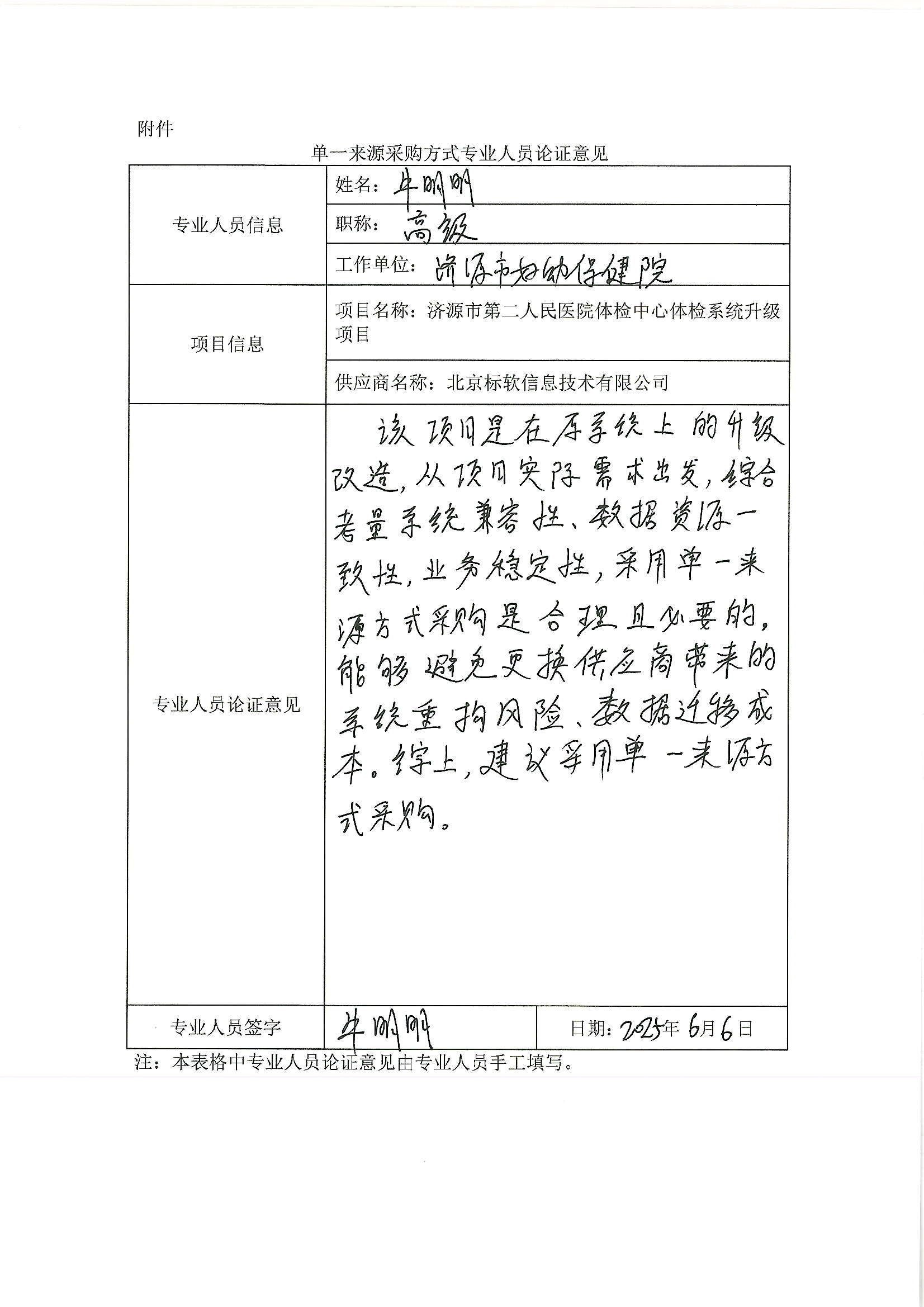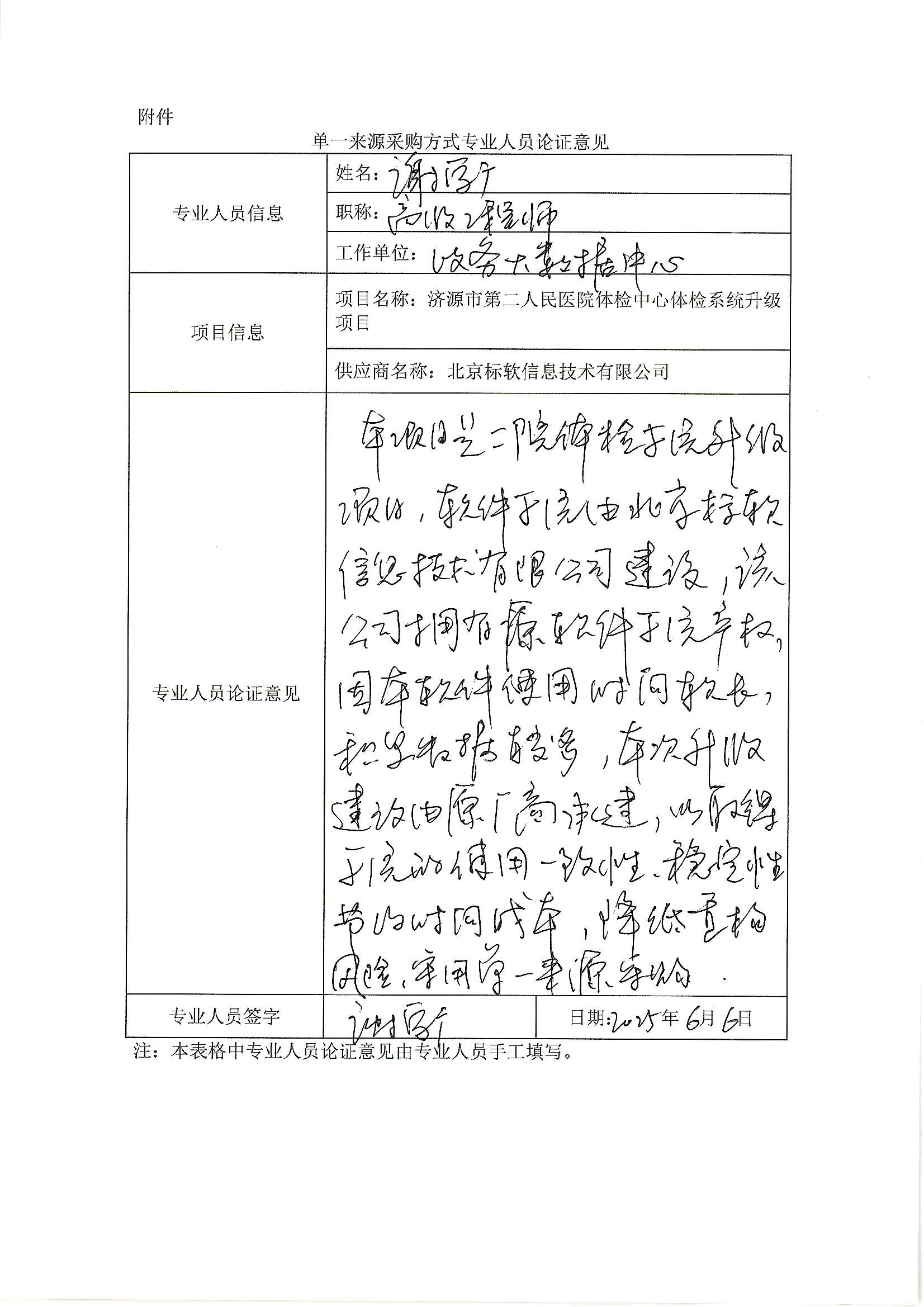5.采用单一来源采购方式的原因及说明:采购人单位原有的体检系统已使用多年,基于医院体检业务进一步发展的现实状况,需对原有体检软件进行升级改造,以满足实际工作需要。从技术架构、数据库、系统功能、接口、业务协同、资源调配等方面来说,在原有系统的基础上升级改造和延续,能够保证业务数据一致性、系统稳定性、数据延续性,北京标软信息技术有限公司作为原系统开发商,拥有该软件产品完整的知识产权,为保证数据一致性、系统稳定性、数据延续性,拟采用单一来源方式进行采购。